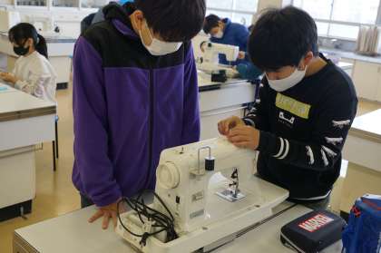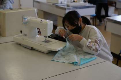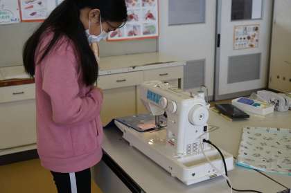 5年2組家庭科の授業です。ミシンでランチョンマットを作成していましてた。慎重にやっています。