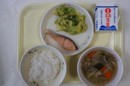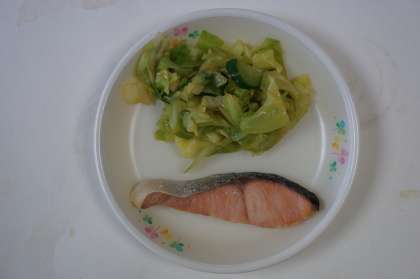 本日の献立は、焼き塩鮭 キャベツとキュウリの即席漬 すいとん です。焼き塩鮭は塩加減が良く御飯に良く合います。キャベツとキュウリの即席漬けは、しょっぱすぎず食べやすいです。歯ごたえもいいですね。すいとんは具の種類が豊富でとてもおいしいです。昔のすいとんとはちがって随分豪華です。