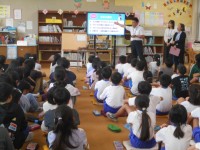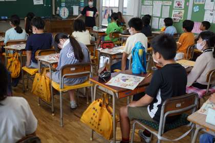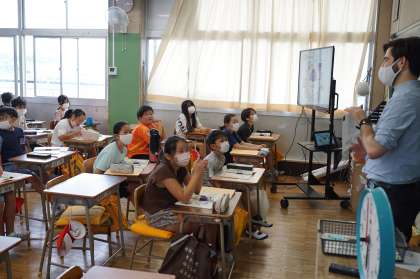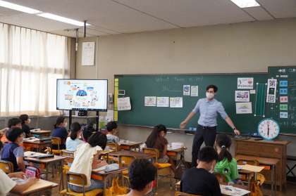 4年生英語の授業です。What time is it?の練習です。study time lunch time 10 a.m.などの言い方を学んでいます。元気に話しています。