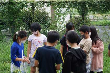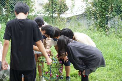 5年生理科の授業です。受粉の様子を調べていきます。アサガオのおしべとめしべを観察し、花粉が着いているかどうか確認します。