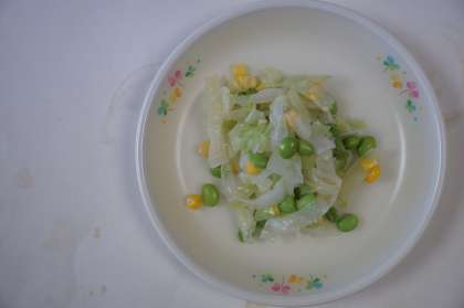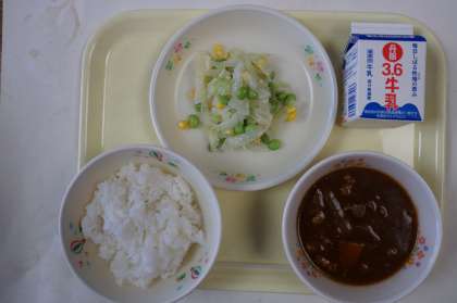 本日の献立は、ハッシュドポーク 枝豆とキャベツのサラダです。ハッシュドポークは味付けが良く御飯によく合います。子どもたちはたくさん食べることと思います。枝豆とキャベツのサラダはさっぱりとした味付けで、ハッシュドポークの口直しにもいいです。枝豆の甘さもいいですね。