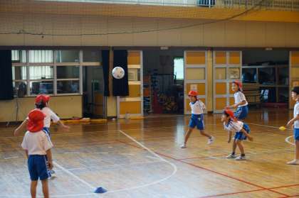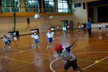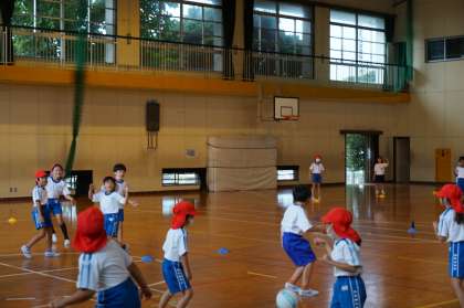 2年生体育の授業です。ドッチボールです。2組に分けて活動しています。