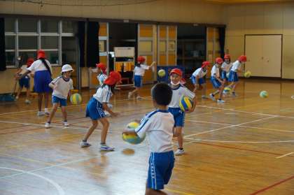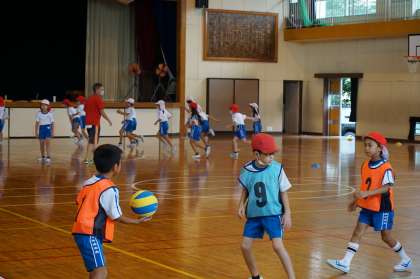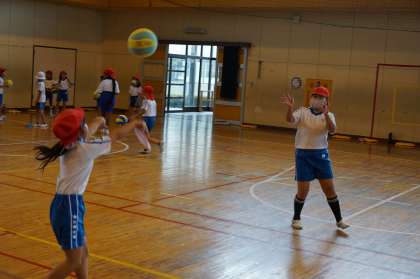 3年1組体育の授業です。ポートボールを行います。ドリブやパスの練習の後にゲームに入ります。
