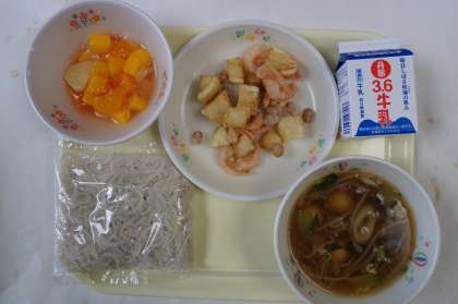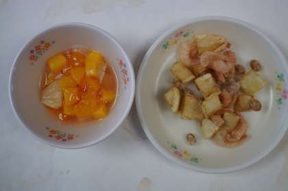 本日の献立は、五目ラーメン、エビとポテトの唐揚げ、アセロラフルーツです。五目ラーメンはつゆの味がよいので、麺に絡めて食べるとおいしいです。エビとポテトの唐揚げは塩味が効いていておいしいです。アセロラフルーツはさっぱりしていて食べやすいです。