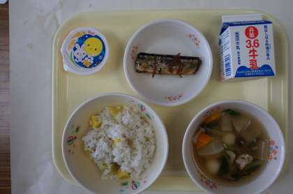 本日の献立は、さつまいもごはん サンマの煮付け 白玉団子汁 十五夜ゼリーです。明日の十五夜にちなんだ献立となっています。さつまいもごはんは、さつまいもがほくほくでとてもおいしいです。サンマは生姜が良くきいていて御飯によく合います。白玉団子汁はとてもおいしいです。十五夜ゼリーは子どもたちは喜んで食べることでしょう。