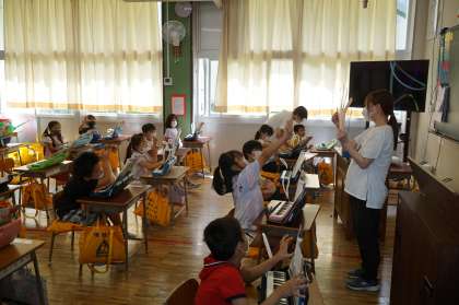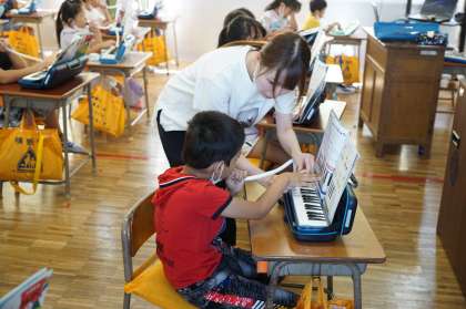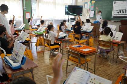 1年1組音楽の授業です。どんぐりさんのおうちという曲です。鍵盤ハーモニカを使います。右手の使い方学んでいきます。
