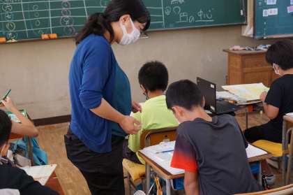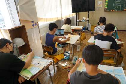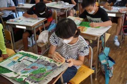 6年1組図工の授業です。校舎の絵の色づけに入っています。配色や塗り方に工夫が見られます。