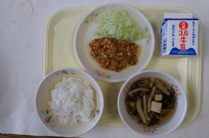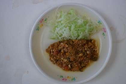 本日の献立は、タコライス、ボイルドキャベツ、もずくスープです。タコライスとボイルドキャベツを混ぜて、ごはんにのせて食べました。キャベツの歯ごたえや、タコライスのピリ辛感がとてもよく、暑さ吹き飛ばすスタミナになります。もずくスープはすっきりしていて、タコライスの口直しにもいいです。