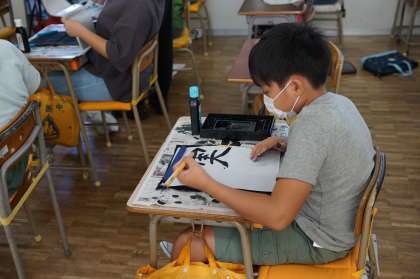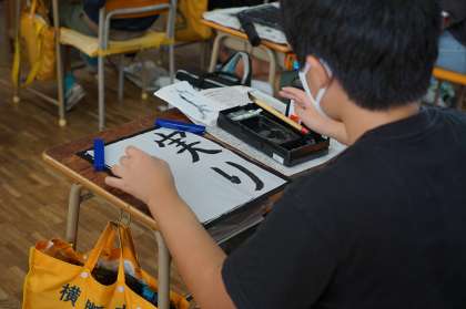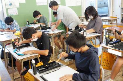 6年2組書写の授業です。実りの秋の清書です。落ち着いた雰囲気の中で書いています。