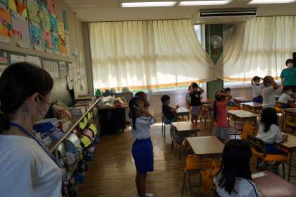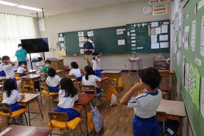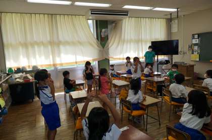 1年2組英語の授業です。体や顔の部分について、ALTが話した言葉の部分を手で押さえます。間違ってもご愛敬です。