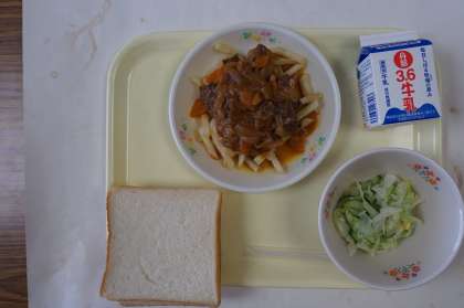 本日の献立は、角形食パン、メキシカンビーフソテー、キャベツとコーンのサラダです。