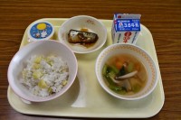 本日の献立は、ジャンバラヤ、カボチャのチーズフライ、たまごと小松菜のスープです。