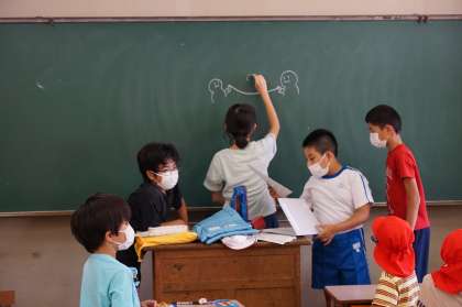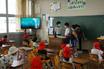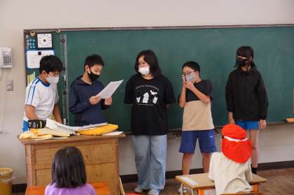 今日の縦割り活動は、10月に実施する縦割り運動会についての説明です。最初に8の字跳びを行い、その後にリレーを行います。その説明をしています。