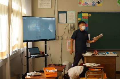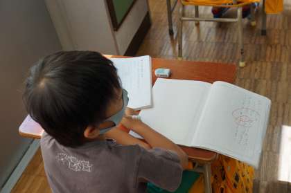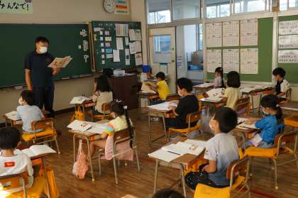 1年1組国語の授業です。がっこうでみつけたよの単元です。見つけたことをカードにまとめていきます。3時間目にダンゴムシを見つけて、気づいたことをまとめていきます。