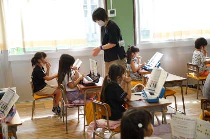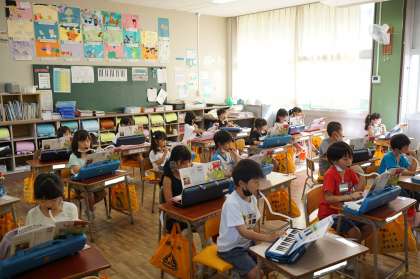 全員で鍵盤ハーモニカを吹きます。音出しに離れてきました。きれいな音が教室に響きます。