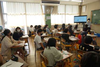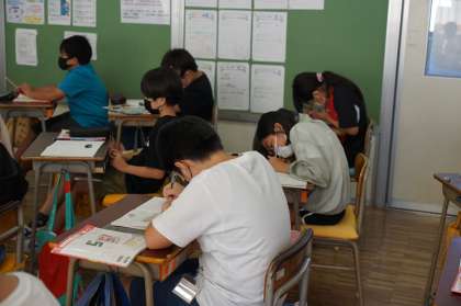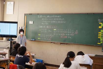 5年生算数の授業です。最小公倍数の考え方を使って、正方形の一辺の長さを求めます。5人の異なった考え方を聞いて、自分の考え方と同じかどうか判断します。