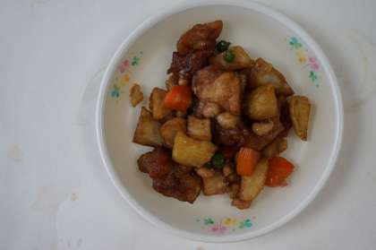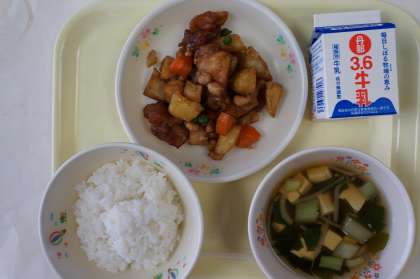 本日の献立は、鶏肉とジャガイモの揚げ煮、わかめスープです。鶏肉ジャガイモの揚げ煮は、味付けが良く御飯によく合います。子どもたちもたくさん食べると思います。わかめスープはすっきりしていておいしいです。