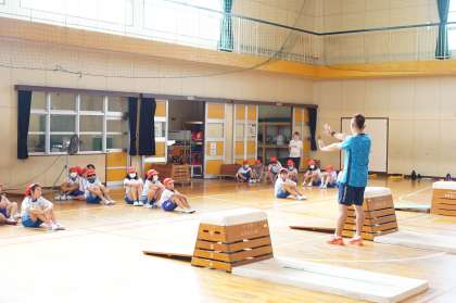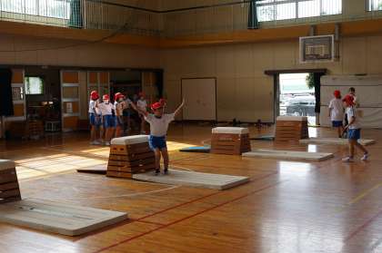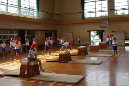 4年生体育の授業です。跳び箱です。ついた手より肩が前に出せるかどうかがポイントです。