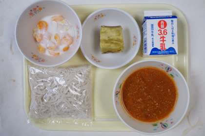 本日の献立は、ソフト麺、ミートソース、ふかし芋、ヨーグルトサラダです。ソフト麺は粘りけがあるのでミートソースがよく絡み食べやすいです。味もいいですね。ふかし芋は秋を感じます。旬のものを食べられるのも給食のいいところですね。ヨーグルトサラダはさっぱりしていてミートソースの口直しにいいです。