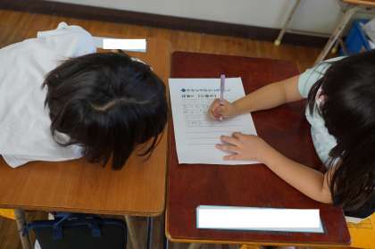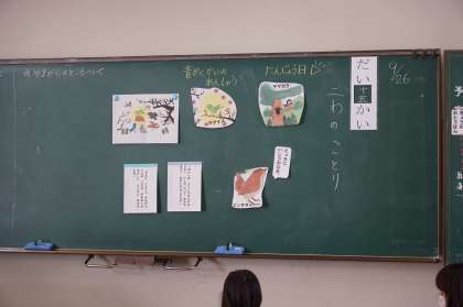 1年2組道徳の授業です。二わのことりという資料を使っています。「みそさざい」という鳥が「やまがら」と「うぐいす」のどちらの家に行くのかを考えます。理由を書いている場面でした。