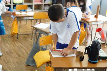 いろいろな形や大きさの立体物を見つけて、形を写し取っています。