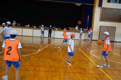バスケットボールクラブです。ゲームを進めています。ドリブルやパスを使ってゴールに迫ります。