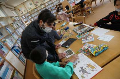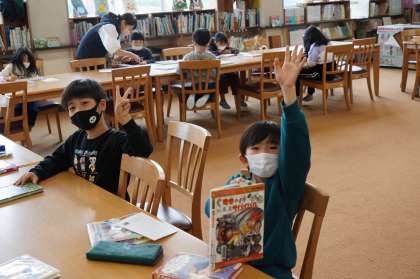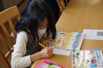 1年1組読解の授業です。自分がお勧めする本を紹介するどくしょゆうびんを行います。どんなところがおもしろいのか、どきどきするのかなどを書いていきます。絵も描きます。