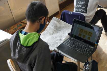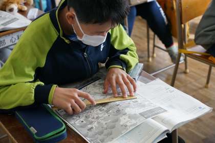 6年2組算数の授業です。拡大図と縮図で学んだことを活用し、12月の鎌倉社会科見学の地図を見ていきます。地図上の1cmが何mなのか、歩いておよそどのくらいかかるのかなど、学んだことを生かします。