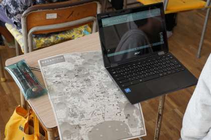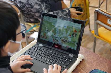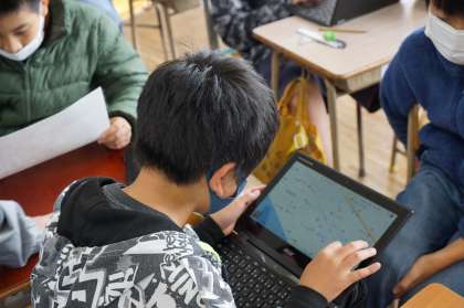 6年1組算数の授業です。拡大図と縮図の活用で、地図上の距離や時間を調べていきます。見学の計画をたてるときに、時間配分を考えることに役立てます。