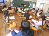 1年2組国語の授業です。めだかのぼうけんの単元です。段落の内容をノートに書き、ペアで確認しています。