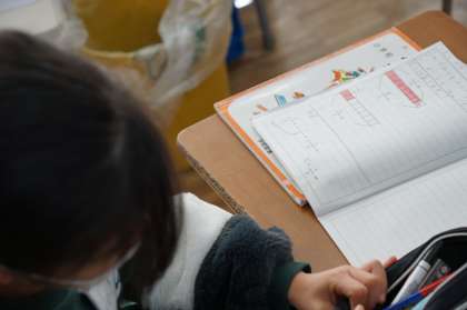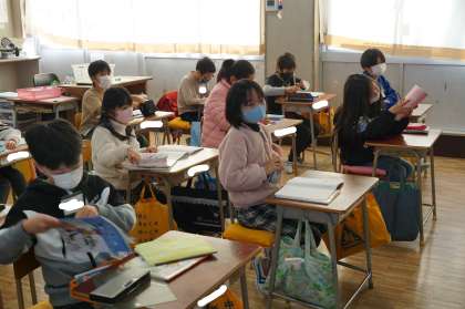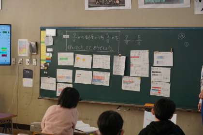 3年2組算数の授業です。分数の計算を行います。足し算引き算の計算だけでなく、問題文がなにをきいているのか考えます。