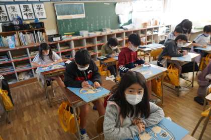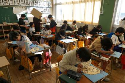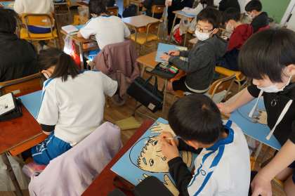 4年生図工の授業です。おどろいた自分の顔を彫っていきます。あと数回で仕上げるので集中して行います。