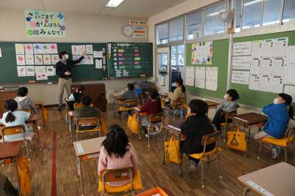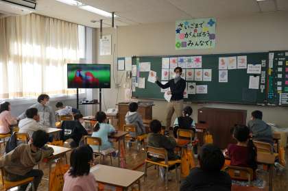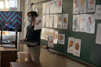 1年1組英語の授業です。身近な果物や野菜、食べ物や動物などの言い方を練習しています。リズムよく声を出していきます。