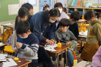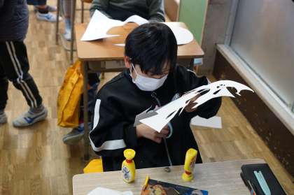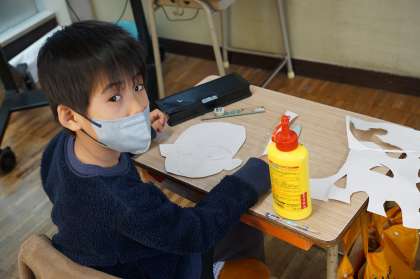 画用紙を使って、目などの顔の部分を貼り付けていきます。どんな作品ができるか楽しみですね。
