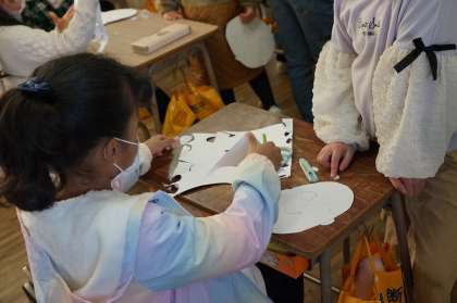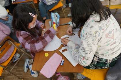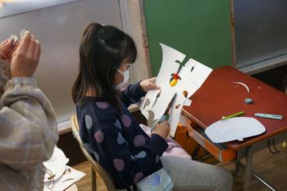 2年生図工の授業です。画用紙を使って顔の紙版画を作ります。