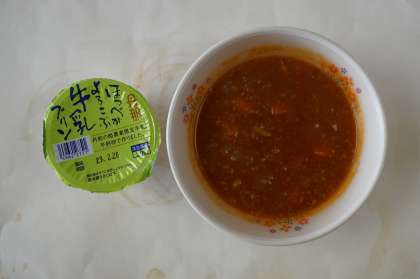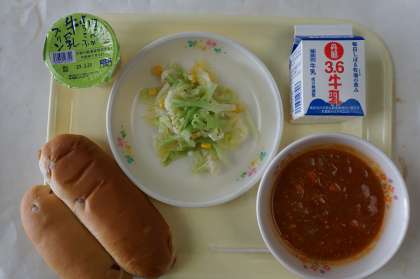 本日の献立は、リンゴ入りロールパン、カリフローレサラダ、チリコンカン、ミルクプリンです。リンゴ入りロールパンは、リンゴーの甘みが感じられ、子どもたちは喜んで食べることと思います。沼津産のカリフローレを使ったサラダはさっぱりしていて、チリコンカンの口直しにもいいです。チリコンカンは様々な調味料が使われていてとてもおいしく、パンによく合います。ミルクプリンは子どもたちは大喜びで食べることでしょう。