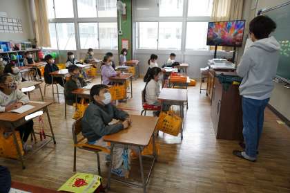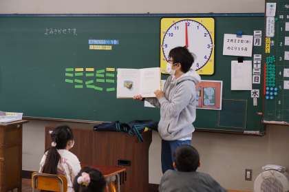 おはなし☆きらのこ1年1組です。『てぶくろ』というお話です。雪道を歩いていたおじいさんが片方の手袋をなくしてしまったようです。その手袋には… 子どもたちはお話を楽しんでいます。