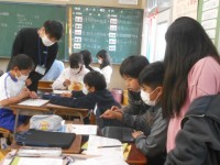 5年生家庭科の授業です。ゆで野菜サラダをつくる調理実習です。ジャガイモやブロッコリー、ニンジンや卵、キャベツなどを用意しています。