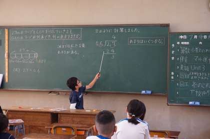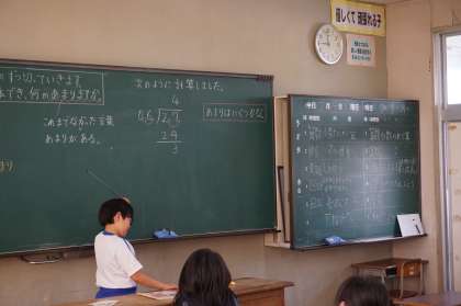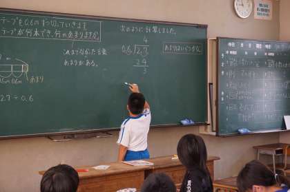 5年生算数の授業です。2.7mのテープを0.6mずつ切っていきます。0.6mのテープが何本でき、何mあまりができるのかを考えます。