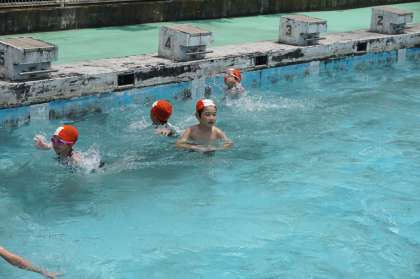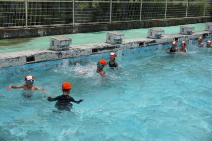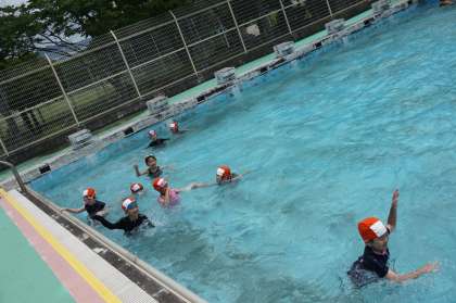 洗濯機が始まりました。ぐるぐる回って流れをつくります。浮くことができる子は、流れに身を任せます。