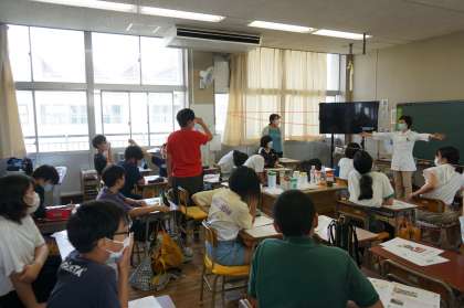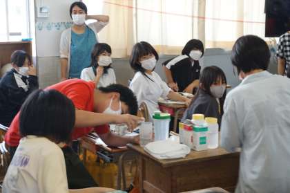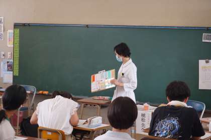 後半は、学校薬剤師の方に、薬の飲み方の注意点についてお話しいただきました。薬によっては、お茶やジュースに反応してしまい、薬の効果がなくなってしまうことを実験で確かめました。また、たばこの副流煙がどこまで広がるのかをひもで確かめました。