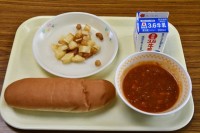 本日の献立は、二色丼(鶏そぼろ 炒り卵) 味噌けんちん汁です。二色丼は、鶏そぼろのしょっぱさと炒り卵の甘さが御飯の上で混ざり合いとてもいい味になっています。暑い夏にスタミナをつけるためにも、たくさん食べてほしいものです。味噌けんちん汁は味噌味が良く、具材が豊富で食べ応えがあります。汗で失った塩分の補給にもいいですね。