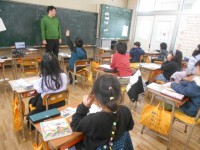 2年2組音楽の授業です。各グループで考えた音楽について発表します。虫の声を中心としたグループや、唇で出せる音のグループなどがありました。