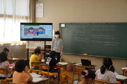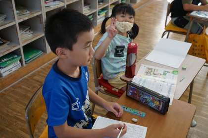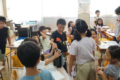 2年2組算数の授業です。「かさ」についての学習が始まりました。同じ大きさの容器なら、色は変わっていてもいいよ、ということで、同じ水筒を持っていた二人の子がいたので、大きさが同じかどうかを調べていました。
