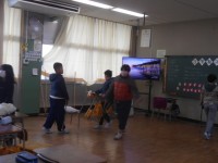 4年生体育の授業です。輪に向かって飛んでいき、進んでいきます。バランスを崩さないようにします。