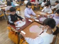 1年生学活の授業です。けがをしてお休みをしている支援員の先生にメッセージを送ります。優しい言葉が書かれています。