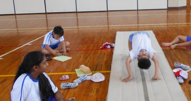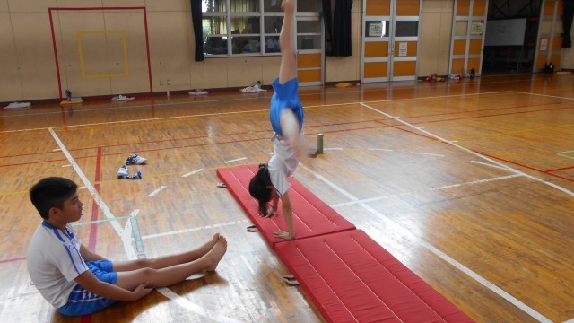 マット運動の時間です。自分の力に合わせて、友達と教え合って技を磨いています。