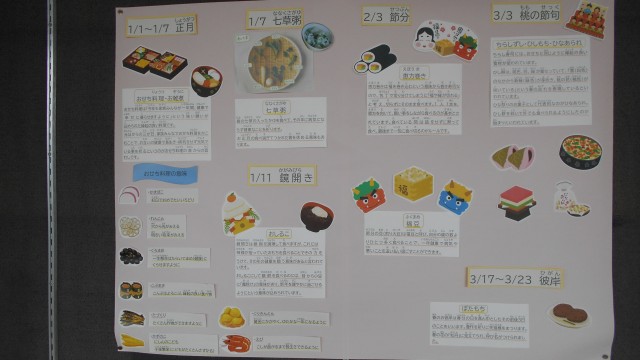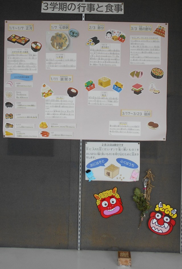 2月3日は節分です。3階の家庭科室の廊下には、栄養教諭が作成した掲示物が貼られています。3学期には、様々な年中行事があり、伝統的に食べられてきた行事食があります。今日の給食には福豆。「お豆おいしかったよ!」と子供たちが話していました。