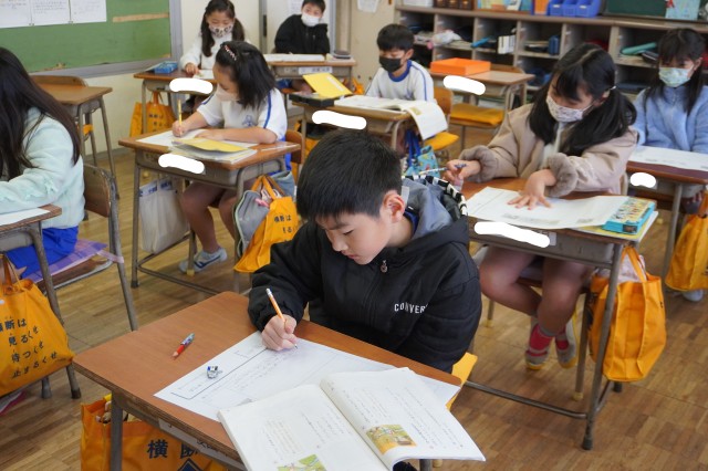 2年2組国語の授業です。何があったのかなの単元です。絵からお話を作ります。うさぎに名前をつけたり、話し言葉をほ入れたりして楽しみながらお話を作っています。