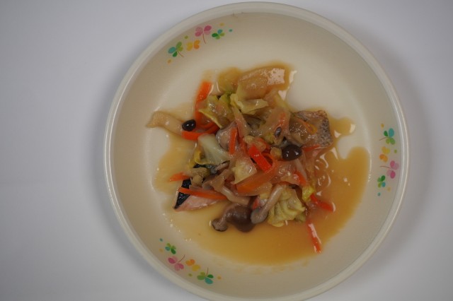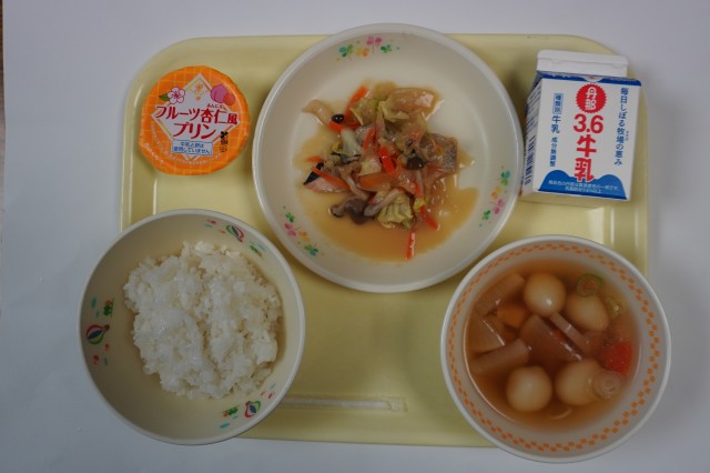 本日献立は、鮭のちゃんちゃん焼き、芋団子汁、杏仁プリンです。鮭のちゃんちゃん焼きは味噌と混ぜて食べるのがとてもおいしいです。芋団子汁はつゆの味がとてもよく、また芋団子の歯触りがいいです。杏仁プリンは子どもたちは喜んで食べることでしょう。